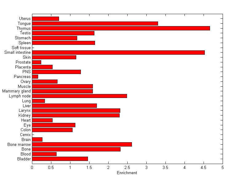 The expression level is normalized with tissue-library size. Each value for a gene in a tissue is a ratio of observed ESTs to the expected one in this tissue. The expected number of ESTs is the product of total ESTs of the gene and the fraction of total ESTs in the tissue among all ESTs in 30 tissues.