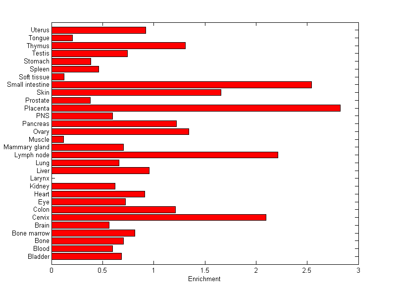 The expression level is normalized with tissue-library size. Each value for a gene in a tissue is a ratio of observed ESTs to the expected one in this tissue. The expected number of ESTs is the product of total ESTs of the gene and the fraction of total ESTs in the tissue among all ESTs in 30 tissues.