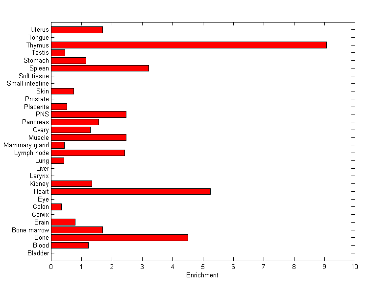 The expression level is normalized with tissue-library size. Each value for a gene in a tissue is a ratio of observed ESTs to the expected one in this tissue. The expected number of ESTs is the product of total ESTs of the gene and the fraction of total ESTs in the tissue among all ESTs in 30 tissues.