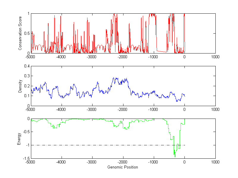 The energy profile (green curve) is about energy for module detection based on TF interaction. The positions with energy less than -1 indicate the existence of CRMs.