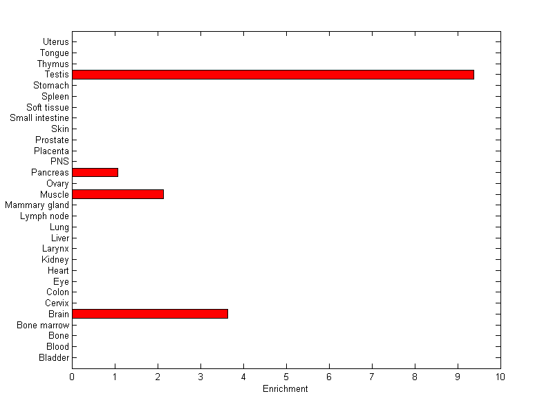 The expression level is normalized with tissue-library size. Each value for a gene in a tissue is a ratio of observed ESTs to the expected one in this tissue. The expected number of ESTs is the product of total ESTs of the gene and the fraction of total ESTs in the tissue among all ESTs in 30 tissues.