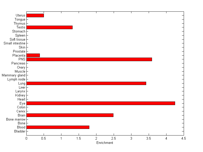 The expression level is normalized with tissue-library size. Each value for a gene in a tissue is a ratio of observed ESTs to the expected one in this tissue. The expected number of ESTs is the product of total ESTs of the gene and the fraction of total ESTs in the tissue among all ESTs in 30 tissues.