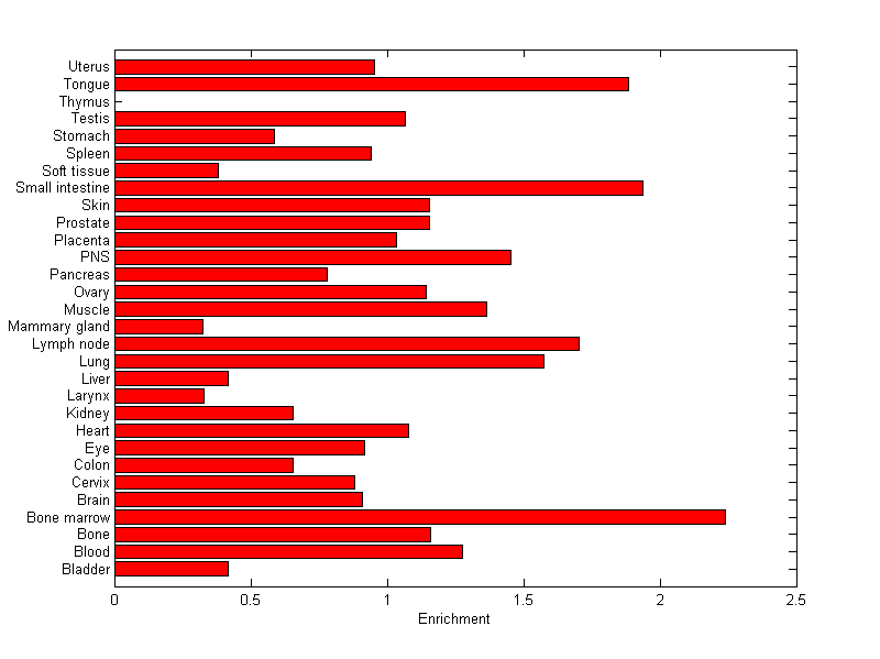 The expression level is normalized with tissue-library size. Each value for a gene in a tissue is a ratio of observed ESTs to the expected one in this tissue. The expected number of ESTs is the product of total ESTs of the gene and the fraction of total ESTs in the tissue among all ESTs in 30 tissues.