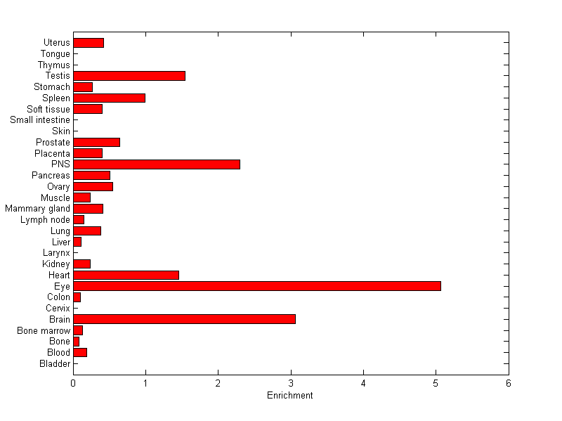 The expression level is normalized with tissue-library size. Each value for a gene in a tissue is a ratio of observed ESTs to the expected one in this tissue. The expected number of ESTs is the product of total ESTs of the gene and the fraction of total ESTs in the tissue among all ESTs in 30 tissues.