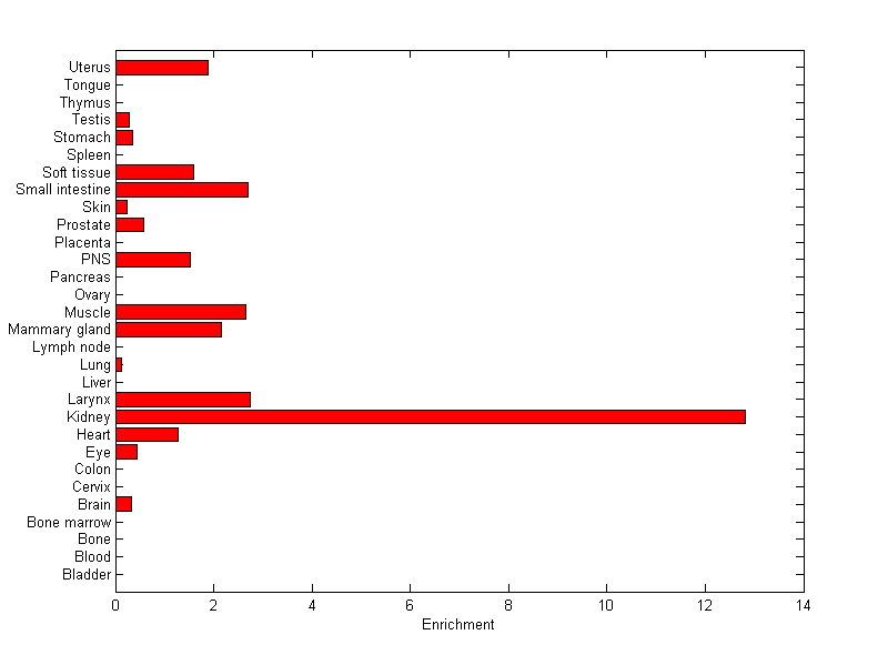 The expression level is normalized with tissue-library size. Each value for a gene in a tissue is a ratio of observed ESTs to the expected one in this tissue. The expected number of ESTs is the product of total ESTs of the gene and the fraction of total ESTs in the tissue among all ESTs in 30 tissues.