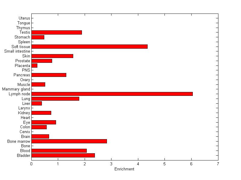The expression level is normalized with tissue-library size. Each value for a gene in a tissue is a ratio of observed ESTs to the expected one in this tissue. The expected number of ESTs is the product of total ESTs of the gene and the fraction of total ESTs in the tissue among all ESTs in 30 tissues.