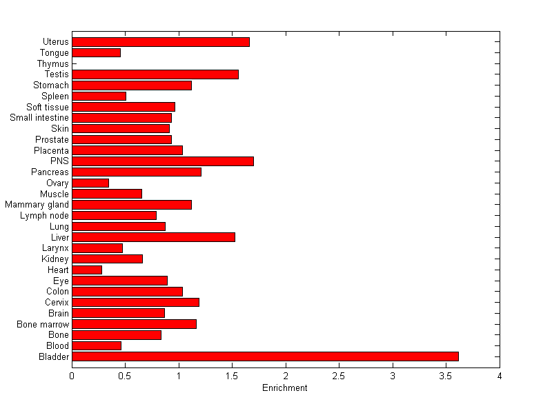 The expression level is normalized with tissue-library size. Each value for a gene in a tissue is a ratio of observed ESTs to the expected one in this tissue. The expected number of ESTs is the product of total ESTs of the gene and the fraction of total ESTs in the tissue among all ESTs in 30 tissues.