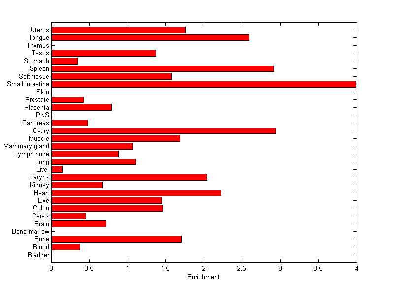 The expression level is normalized with tissue-library size. Each value for a gene in a tissue is a ratio of observed ESTs to the expected one in this tissue. The expected number of ESTs is the product of total ESTs of the gene and the fraction of total ESTs in the tissue among all ESTs in 30 tissues.