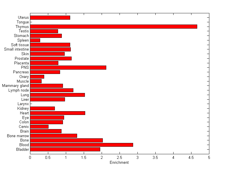 The expression level is normalized with tissue-library size. Each value for a gene in a tissue is a ratio of observed ESTs to the expected one in this tissue. The expected number of ESTs is the product of total ESTs of the gene and the fraction of total ESTs in the tissue among all ESTs in 30 tissues.