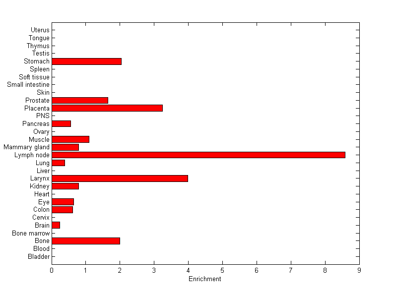 The expression level is normalized with tissue-library size. Each value for a gene in a tissue is a ratio of observed ESTs to the expected one in this tissue. The expected number of ESTs is the product of total ESTs of the gene and the fraction of total ESTs in the tissue among all ESTs in 30 tissues.