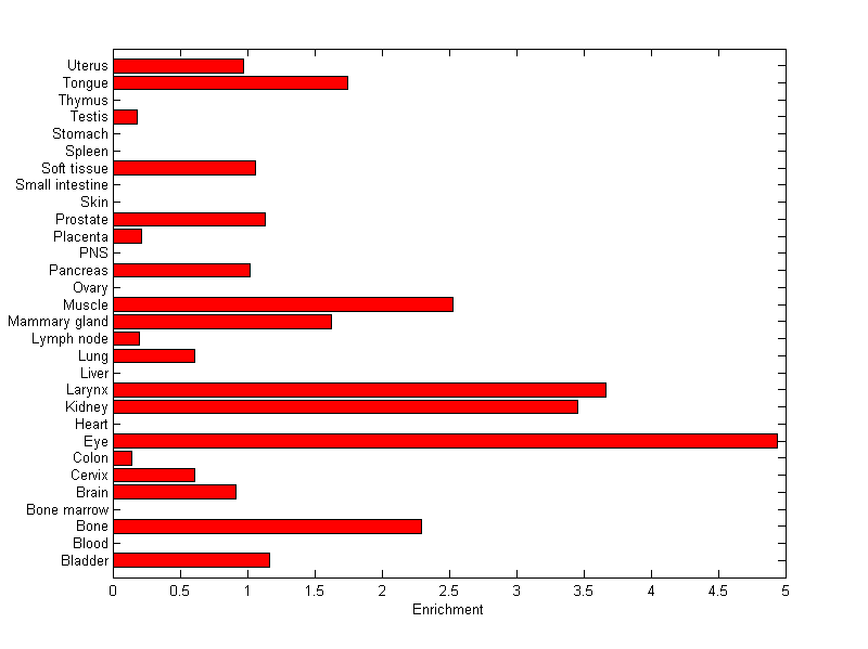 The expression level is normalized with tissue-library size. Each value for a gene in a tissue is a ratio of observed ESTs to the expected one in this tissue. The expected number of ESTs is the product of total ESTs of the gene and the fraction of total ESTs in the tissue among all ESTs in 30 tissues.