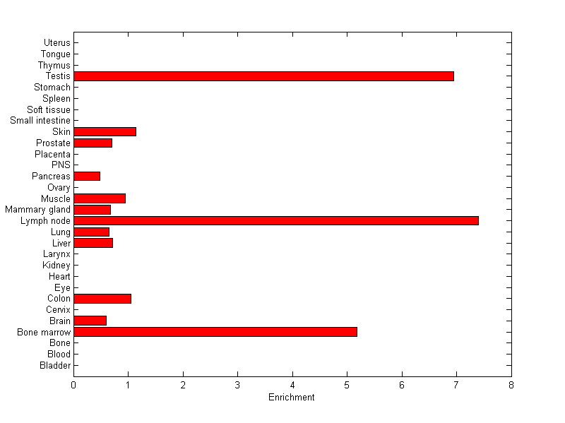The expression level is normalized with tissue-library size. Each value for a gene in a tissue is a ratio of observed ESTs to the expected one in this tissue. The expected number of ESTs is the product of total ESTs of the gene and the fraction of total ESTs in the tissue among all ESTs in 30 tissues.