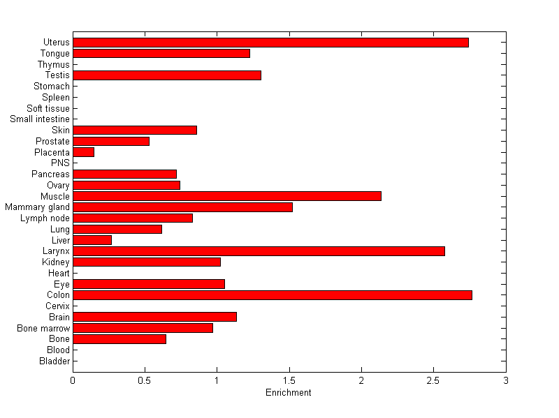The expression level is normalized with tissue-library size. Each value for a gene in a tissue is a ratio of observed ESTs to the expected one in this tissue. The expected number of ESTs is the product of total ESTs of the gene and the fraction of total ESTs in the tissue among all ESTs in 30 tissues.