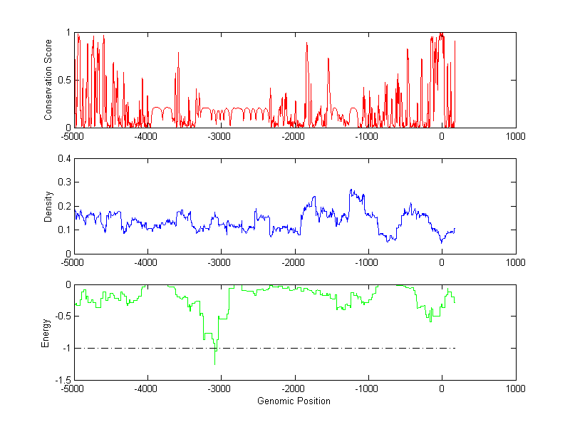 The energy profile (green curve) is about energy for module detection based on TF interaction. The positions with energy less than -1 indicate the existence of CRMs.