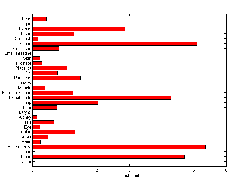 The expression level is normalized with tissue-library size. Each value for a gene in a tissue is a ratio of observed ESTs to the expected one in this tissue. The expected number of ESTs is the product of total ESTs of the gene and the fraction of total ESTs in the tissue among all ESTs in 30 tissues.