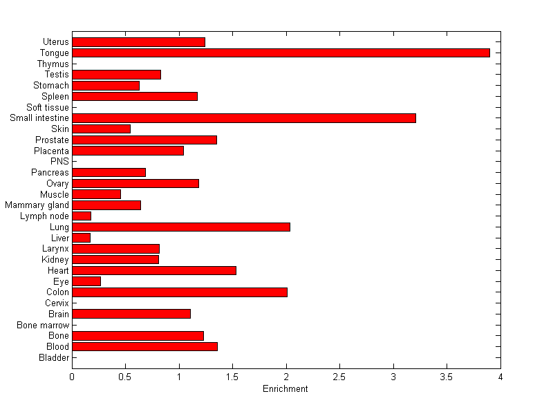 The expression level is normalized with tissue-library size. Each value for a gene in a tissue is a ratio of observed ESTs to the expected one in this tissue. The expected number of ESTs is the product of total ESTs of the gene and the fraction of total ESTs in the tissue among all ESTs in 30 tissues.