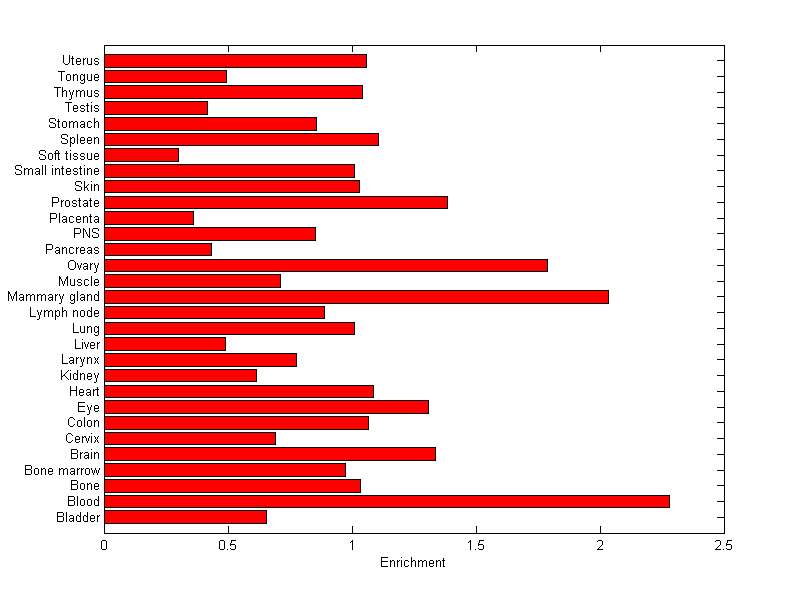 The expression level is normalized with tissue-library size. Each value for a gene in a tissue is a ratio of observed ESTs to the expected one in this tissue. The expected number of ESTs is the product of total ESTs of the gene and the fraction of total ESTs in the tissue among all ESTs in 30 tissues.