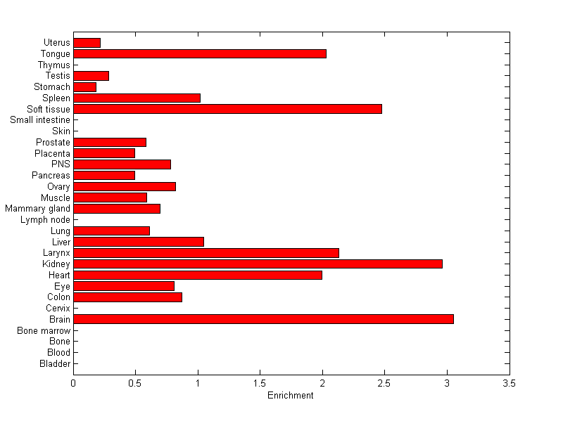 The expression level is normalized with tissue-library size. Each value for a gene in a tissue is a ratio of observed ESTs to the expected one in this tissue. The expected number of ESTs is the product of total ESTs of the gene and the fraction of total ESTs in the tissue among all ESTs in 30 tissues.