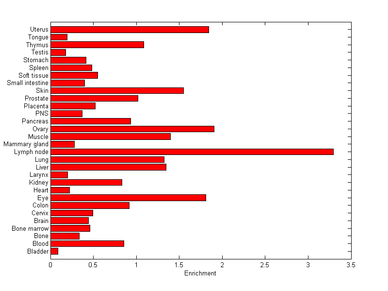 The expression level is normalized with tissue-library size. Each value for a gene in a tissue is a ratio of observed ESTs to the expected one in this tissue. The expected number of ESTs is the product of total ESTs of the gene and the fraction of total ESTs in the tissue among all ESTs in 30 tissues.