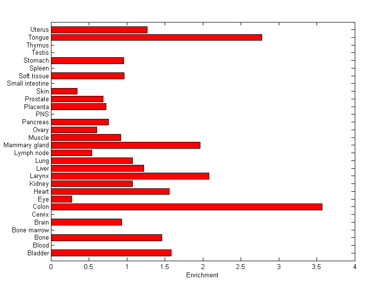 The expression level is normalized with tissue-library size. Each value for a gene in a tissue is a ratio of observed ESTs to the expected one in this tissue. The expected number of ESTs is the product of total ESTs of the gene and the fraction of total ESTs in the tissue among all ESTs in 30 tissues.