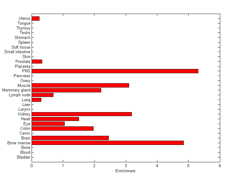 The expression level is normalized with tissue-library size. Each value for a gene in a tissue is a ratio of observed ESTs to the expected one in this tissue. The expected number of ESTs is the product of total ESTs of the gene and the fraction of total ESTs in the tissue among all ESTs in 30 tissues.