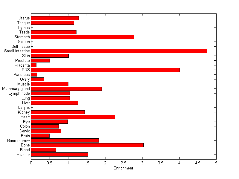 The expression level is normalized with tissue-library size. Each value for a gene in a tissue is a ratio of observed ESTs to the expected one in this tissue. The expected number of ESTs is the product of total ESTs of the gene and the fraction of total ESTs in the tissue among all ESTs in 30 tissues.