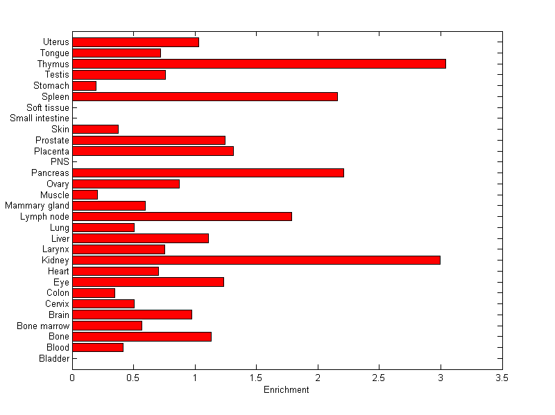 The expression level is normalized with tissue-library size. Each value for a gene in a tissue is a ratio of observed ESTs to the expected one in this tissue. The expected number of ESTs is the product of total ESTs of the gene and the fraction of total ESTs in the tissue among all ESTs in 30 tissues.
