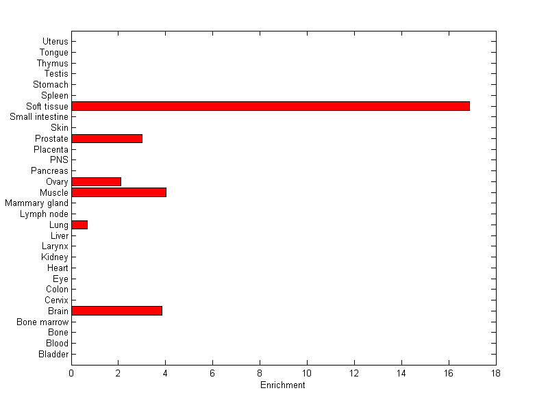 The expression level is normalized with tissue-library size. Each value for a gene in a tissue is a ratio of observed ESTs to the expected one in this tissue. The expected number of ESTs is the product of total ESTs of the gene and the fraction of total ESTs in the tissue among all ESTs in 30 tissues.