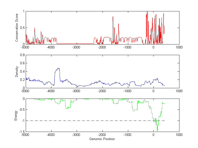 The energy profile (green curve) is about energy for module detection based on TF interaction. The positions with energy less than -1 indicate the existence of CRMs.