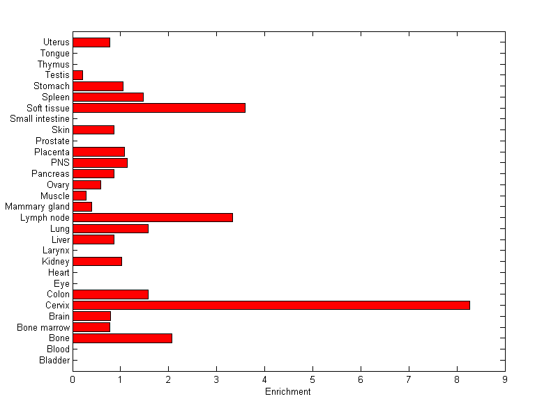 The expression level is normalized with tissue-library size. Each value for a gene in a tissue is a ratio of observed ESTs to the expected one in this tissue. The expected number of ESTs is the product of total ESTs of the gene and the fraction of total ESTs in the tissue among all ESTs in 30 tissues.