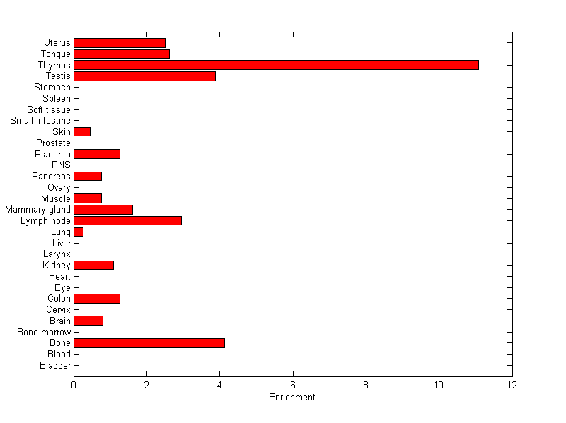 The expression level is normalized with tissue-library size. Each value for a gene in a tissue is a ratio of observed ESTs to the expected one in this tissue. The expected number of ESTs is the product of total ESTs of the gene and the fraction of total ESTs in the tissue among all ESTs in 30 tissues.