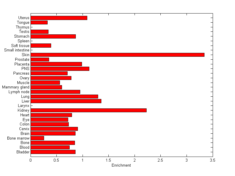 The expression level is normalized with tissue-library size. Each value for a gene in a tissue is a ratio of observed ESTs to the expected one in this tissue. The expected number of ESTs is the product of total ESTs of the gene and the fraction of total ESTs in the tissue among all ESTs in 30 tissues.