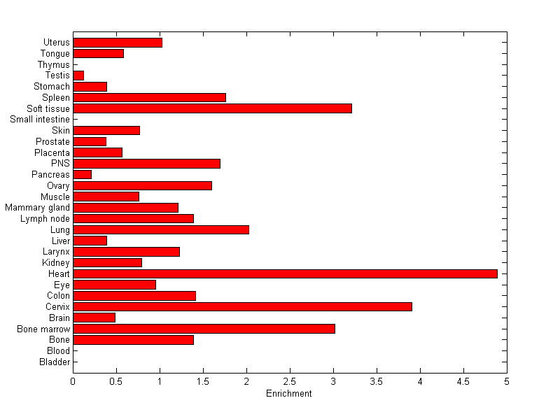 The expression level is normalized with tissue-library size. Each value for a gene in a tissue is a ratio of observed ESTs to the expected one in this tissue. The expected number of ESTs is the product of total ESTs of the gene and the fraction of total ESTs in the tissue among all ESTs in 30 tissues.