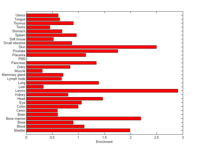 The expression level is normalized with tissue-library size. Each value for a gene in a tissue is a ratio of observed ESTs to the expected one in this tissue. The expected number of ESTs is the product of total ESTs of the gene and the fraction of total ESTs in the tissue among all ESTs in 30 tissues.