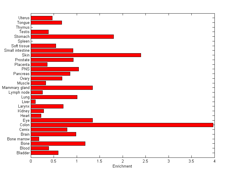 The expression level is normalized with tissue-library size. Each value for a gene in a tissue is a ratio of observed ESTs to the expected one in this tissue. The expected number of ESTs is the product of total ESTs of the gene and the fraction of total ESTs in the tissue among all ESTs in 30 tissues.