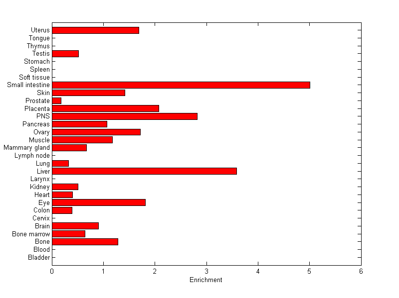The expression level is normalized with tissue-library size. Each value for a gene in a tissue is a ratio of observed ESTs to the expected one in this tissue. The expected number of ESTs is the product of total ESTs of the gene and the fraction of total ESTs in the tissue among all ESTs in 30 tissues.