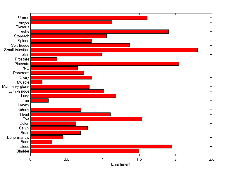 The expression level is normalized with tissue-library size. Each value for a gene in a tissue is a ratio of observed ESTs to the expected one in this tissue. The expected number of ESTs is the product of total ESTs of the gene and the fraction of total ESTs in the tissue among all ESTs in 30 tissues.