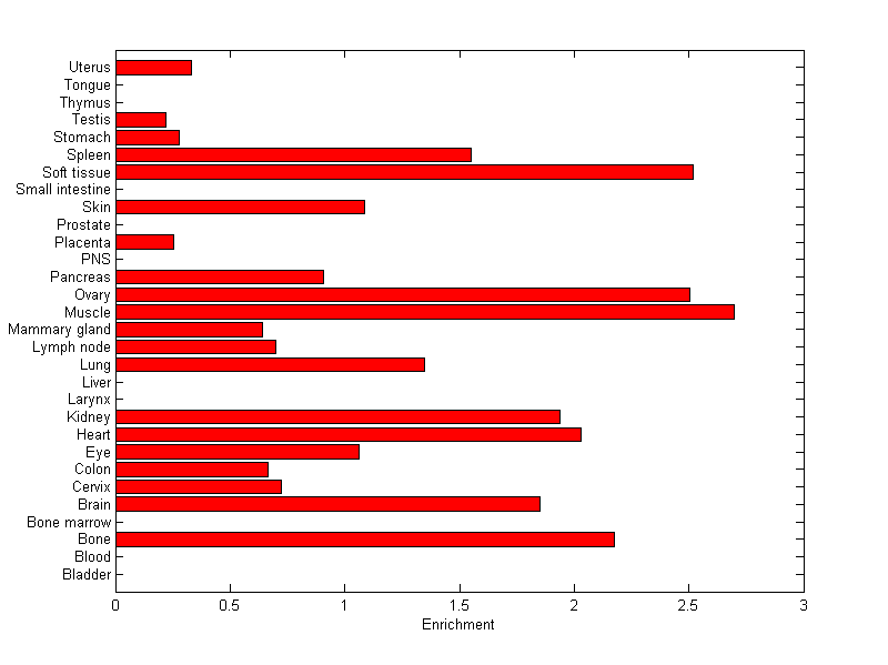 The expression level is normalized with tissue-library size. Each value for a gene in a tissue is a ratio of observed ESTs to the expected one in this tissue. The expected number of ESTs is the product of total ESTs of the gene and the fraction of total ESTs in the tissue among all ESTs in 30 tissues.