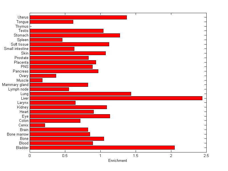 The expression level is normalized with tissue-library size. Each value for a gene in a tissue is a ratio of observed ESTs to the expected one in this tissue. The expected number of ESTs is the product of total ESTs of the gene and the fraction of total ESTs in the tissue among all ESTs in 30 tissues.