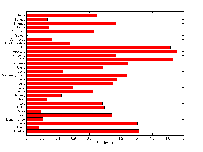 The expression level is normalized with tissue-library size. Each value for a gene in a tissue is a ratio of observed ESTs to the expected one in this tissue. The expected number of ESTs is the product of total ESTs of the gene and the fraction of total ESTs in the tissue among all ESTs in 30 tissues.