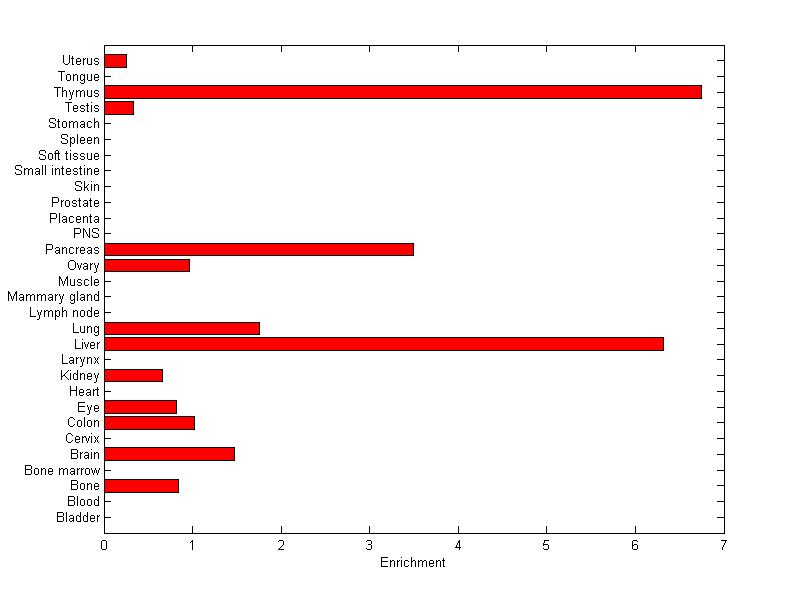 The expression level is normalized with tissue-library size. Each value for a gene in a tissue is a ratio of observed ESTs to the expected one in this tissue. The expected number of ESTs is the product of total ESTs of the gene and the fraction of total ESTs in the tissue among all ESTs in 30 tissues.