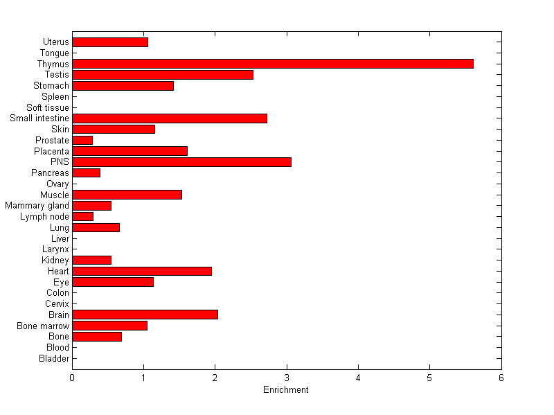 The expression level is normalized with tissue-library size. Each value for a gene in a tissue is a ratio of observed ESTs to the expected one in this tissue. The expected number of ESTs is the product of total ESTs of the gene and the fraction of total ESTs in the tissue among all ESTs in 30 tissues.