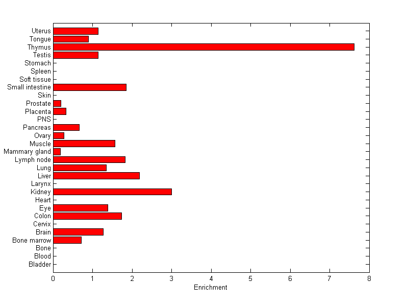 The expression level is normalized with tissue-library size. Each value for a gene in a tissue is a ratio of observed ESTs to the expected one in this tissue. The expected number of ESTs is the product of total ESTs of the gene and the fraction of total ESTs in the tissue among all ESTs in 30 tissues.