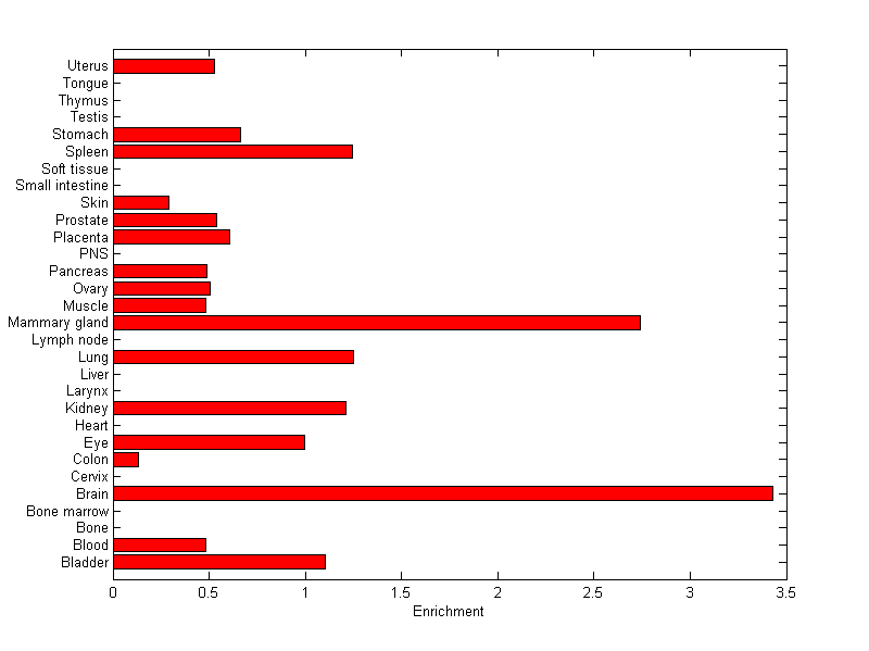 The expression level is normalized with tissue-library size. Each value for a gene in a tissue is a ratio of observed ESTs to the expected one in this tissue. The expected number of ESTs is the product of total ESTs of the gene and the fraction of total ESTs in the tissue among all ESTs in 30 tissues.