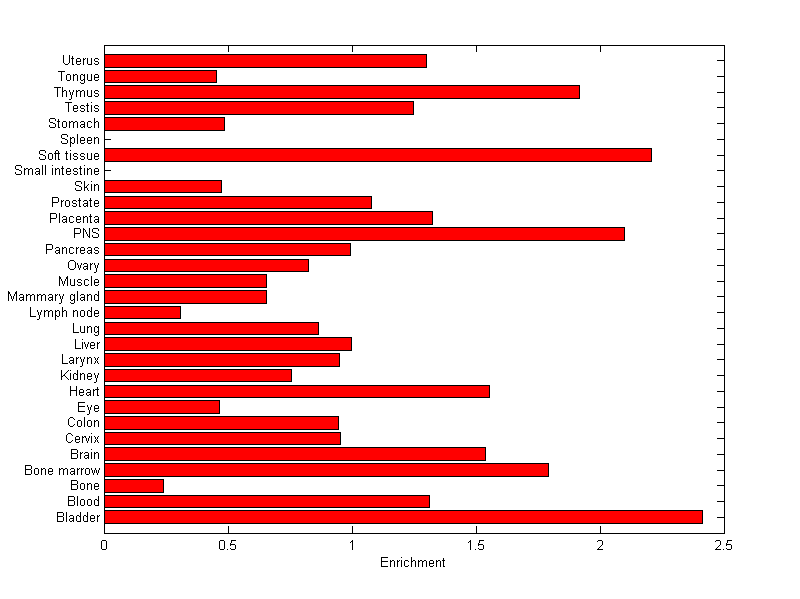 The expression level is normalized with tissue-library size. Each value for a gene in a tissue is a ratio of observed ESTs to the expected one in this tissue. The expected number of ESTs is the product of total ESTs of the gene and the fraction of total ESTs in the tissue among all ESTs in 30 tissues.