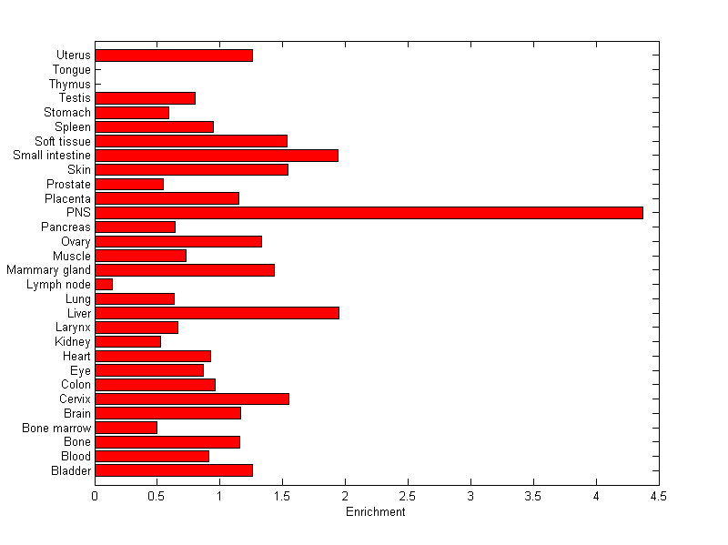 The expression level is normalized with tissue-library size. Each value for a gene in a tissue is a ratio of observed ESTs to the expected one in this tissue. The expected number of ESTs is the product of total ESTs of the gene and the fraction of total ESTs in the tissue among all ESTs in 30 tissues.