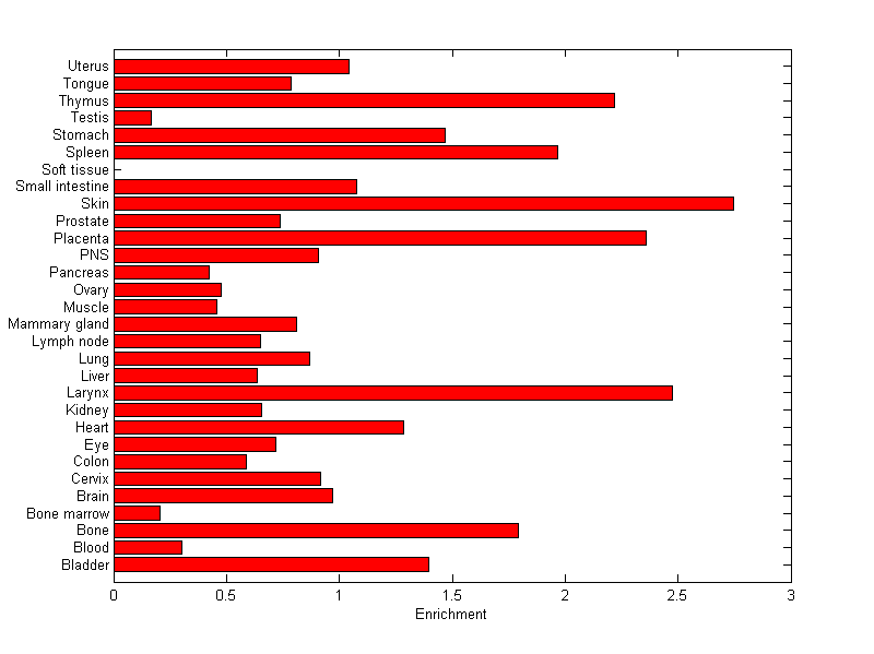 The expression level is normalized with tissue-library size. Each value for a gene in a tissue is a ratio of observed ESTs to the expected one in this tissue. The expected number of ESTs is the product of total ESTs of the gene and the fraction of total ESTs in the tissue among all ESTs in 30 tissues.