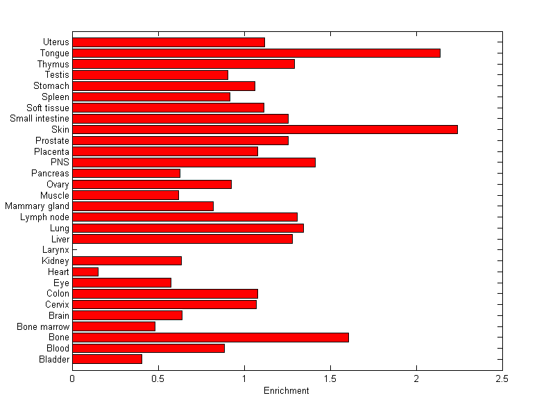 The expression level is normalized with tissue-library size. Each value for a gene in a tissue is a ratio of observed ESTs to the expected one in this tissue. The expected number of ESTs is the product of total ESTs of the gene and the fraction of total ESTs in the tissue among all ESTs in 30 tissues.