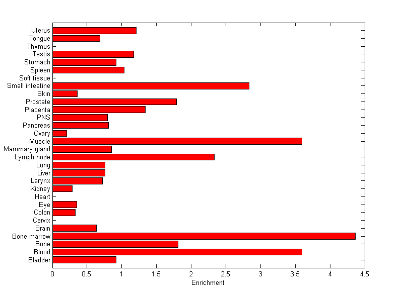 The expression level is normalized with tissue-library size. Each value for a gene in a tissue is a ratio of observed ESTs to the expected one in this tissue. The expected number of ESTs is the product of total ESTs of the gene and the fraction of total ESTs in the tissue among all ESTs in 30 tissues.