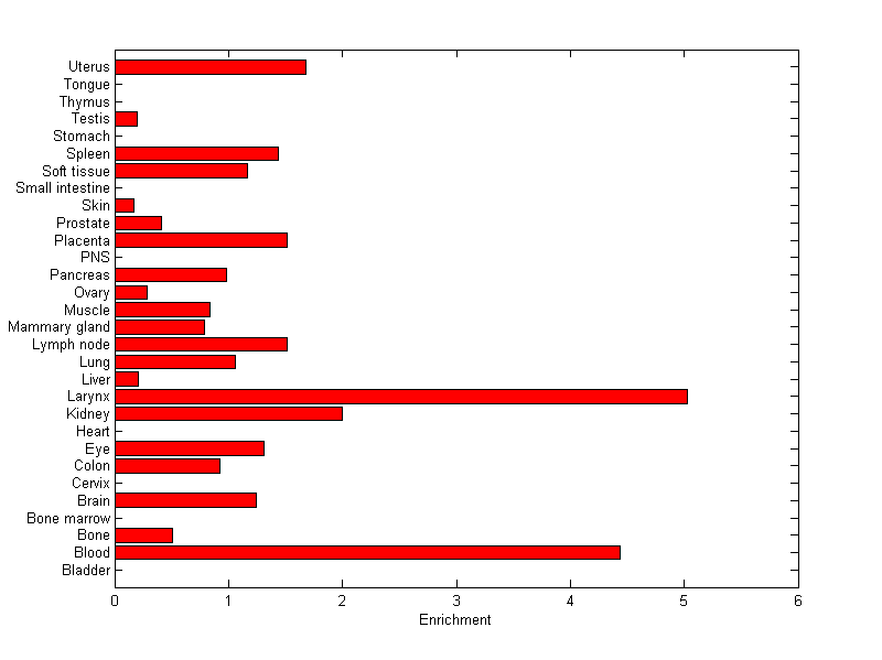 The expression level is normalized with tissue-library size. Each value for a gene in a tissue is a ratio of observed ESTs to the expected one in this tissue. The expected number of ESTs is the product of total ESTs of the gene and the fraction of total ESTs in the tissue among all ESTs in 30 tissues.